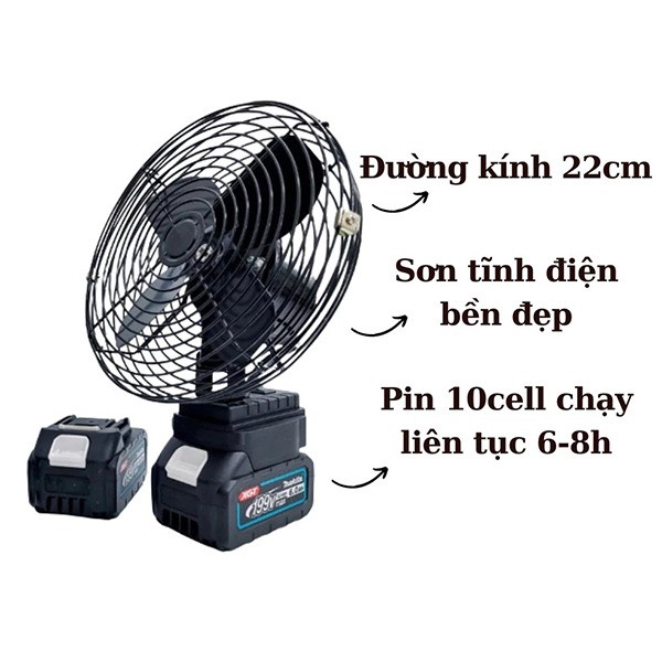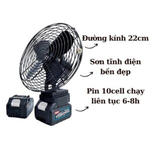 Tùy vào dung lượng pin (ví dụ pin 18V 5.0Ah), quạt có thể hoạt động liên tục từ 5–15 giờ.